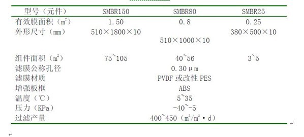 浸没式膜元件的主要性能指标见表1。